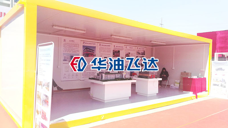 2019年5月6日,華油飛達參加的第三屆裝配式建筑展在雄安新區雄縣包裝城舉行。此次華油飛達通過大型吊車把我們的9米*4米的房子放到光地展位上。